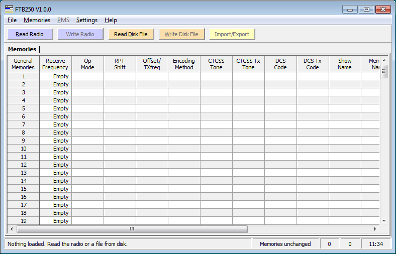 The initial start-up screen is shown below. Before you can make any entries in the grid you must first load a memory image into the program. This can be done either by using the Read Radio button to read from your radio, or by using the Read Disk File button to read a previously saved memory image file from disk.