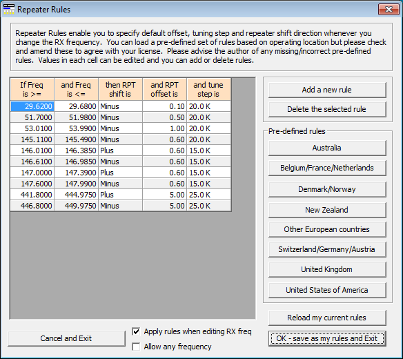 A set of repeater rules can initially be chosen by clicking one of the pre-defined rules buttons. This loads the grid with a set of rules appropriate to the region. The pre-defined rules have been been built using the best information available at the time and may not be in accordance with your local licensing regulations. Please advise the author of any gross inaccuracies or missing band rules.