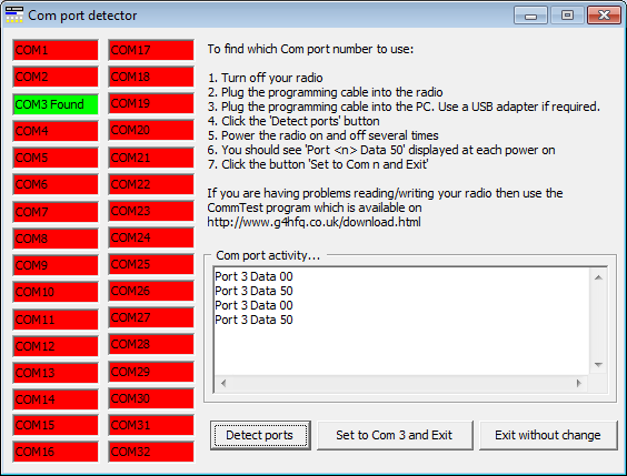 Follow the on-screen instructions to detect and set the COM port for your programming cable. Be aware that each USB socket on your PC will be allocated a different COM port number, so you may need to use this screen again if you change your usual socket.