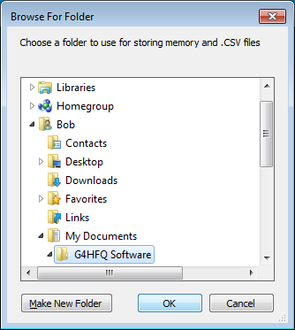 Next to appear is a folder browse window to enable you to choose which folder you want to use for storing memory files and .CSV files. Once you have chosen a folder the window will not be shown again unless you use the Settings menu command Choose a folder for memory and .CSV files. The sample memory files are installed in the same folder as the program was installed - this is usually C:\Program Files\FTB250. If you wish to use the sample files then copy them to the folder you have chosen for storing memory and .CSV files.