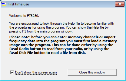 The next small screen shown is an advisory message regarding the restrictions on the program during an evaluation, together with a reminder that you need to either read the radio or load a memory image before the editing capabilities of the program are enabled. To stop this message from appearing in the future tick the checkbox Don't show this screen again and then click Close this window.