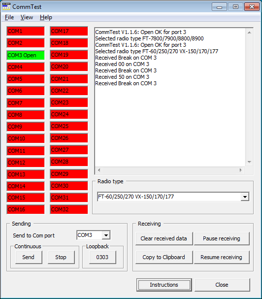 CommTest is a free program to help with checking communication between the radio and the PC. It is available on the Download page of the author's web site. This screenshot shows the communication from a radio after power on. In this instance Com 1 and Com 3 are present on the PC. Note that the last message shows that the radio is connected to Com 3. The VX-110/150 sends 50 when it is powered on and 00 when it is powered off. The Com port that shows traffic when you power the radio on/off is the one to specify in the program.